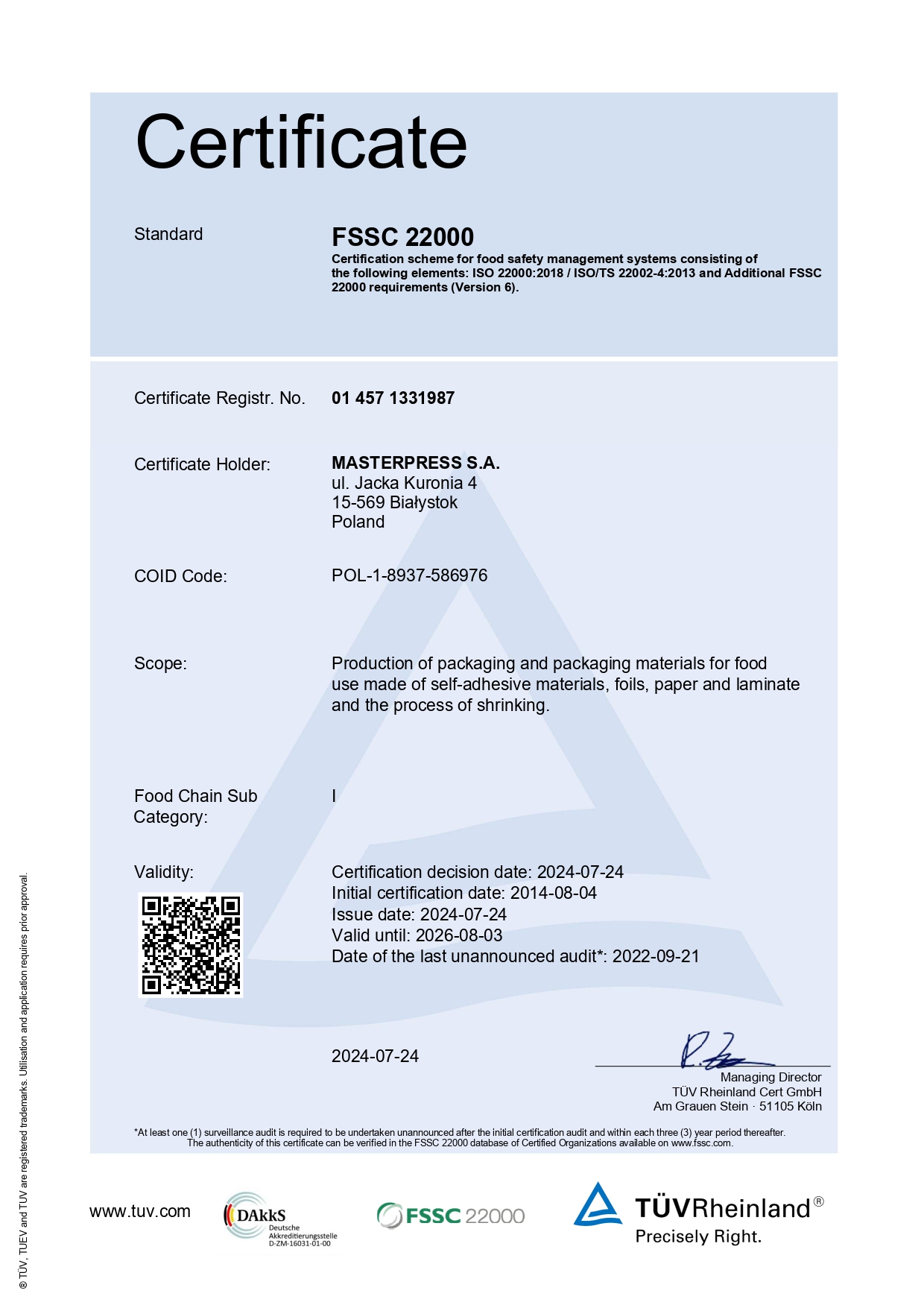 We are an organisation managed by values that constitute the foundation for implementing the company’s strategy and form an integral part of the Quality Policy, which is known to all Masterpress employees. We undertake to constantly improve the implemented Food Safety Management System, thus satisfying the needs of even the most demanding Customers while strengthening confidence in the quality of products manufactured by our company.
